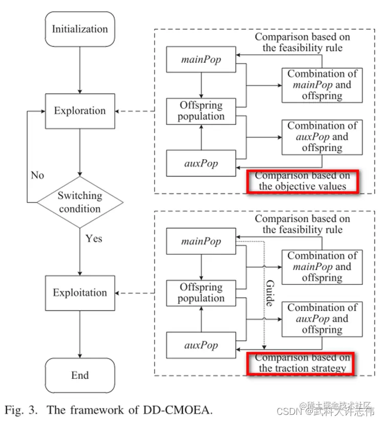 - 其中算法流程图如图3所示,需要注意的是mainPop的选择策略在两个阶段相同,但是auxPop的选择策略在前后两个阶段不同,在Exploration阶段使用目标函数值,在Exploitation阶段使用牵引策略。