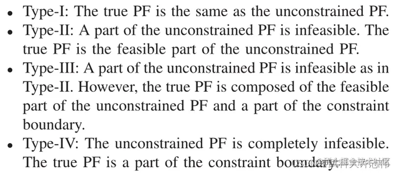 - 根据非约束PF和真实PF的不同关系,这些问题可以分为四类 [4]