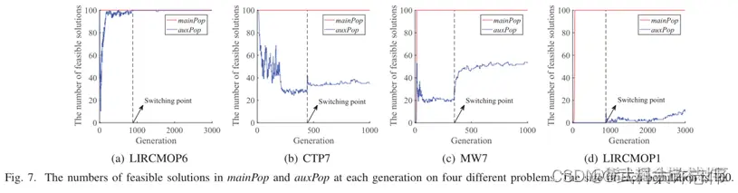 - 图 7 显示了在所提出的 DD-CMOEA 对测试问题的单次运行中,mainPop 和 auxPop(种群大小:100)中可行解决方案的数量。此运行是从 31 个运行中选择的,具有中间 IGD 值。从探索阶段到开发阶段的切换点也如图 7 所示。从图 7 中,我们可以得到以下观察结果。