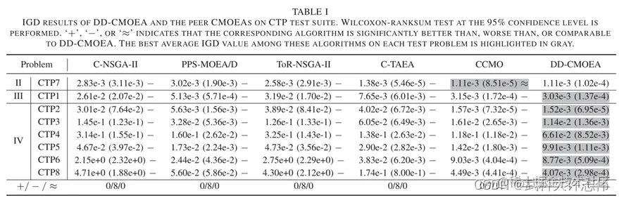 - 在本小节中,将DD-CMOEA在三个测试套件上与五个同行CMOEAs进行比较。我们使用两种广泛使用的度量——反向世代距离(IGD)[33]和hypervolume (HV)[34]——来定量评估它们的性能。由于页面限制,本文仅分析IGD结果,HV结果在补充文件中给出。对IGD和HV结果采用95%置信水平的非参数wilcoxon秩和双边比较检验[35]。它将DD-CMOEA与各竞争对手进行了配对比较。符号' + '、'−'或'≈'表示对应的竞争对手优于、劣于或可与DD-CMOEA相媲美。此外,每个问题的最佳度量值在每个表中以灰色突出显示。