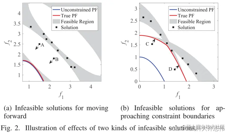 - 尽管文献中的不可行辅助 CMOEA(例如,C-TAEA [7] 和 CCMO [11])在某些 CMPOP 上表现出良好的性能,但在遇到复杂约束时仍然面临困难,部分原因是对不可行解决方案的利用有限。如图 2 所示,不可行的解决方案应根据问题采用不同的方式。具体来说,在图 2(a)中,具有良好目标值的不可行解可用于通过不可行区域(参见 A 和 B)。在这种情况下,需要通过将当前不可行的解决方案向前(左下方向)拉来寻找具有更好目标值的新可行解决方案。另一方面,在图 2(b)中,不可行的解决方案可用于从不可行的一侧接近真实的 PF(参见 C 和 D)。在这种情况下,需要通过将当前不可行的解决方案拉向约束边界(在右上方向)来找到具有较小约束违规的新解决方案。