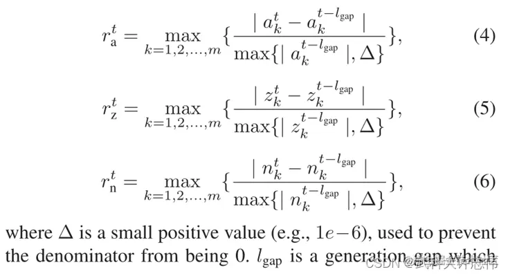 - 3) Decision of Search Stage:在auxPop更新后,auxPop的改进会通过量化的方式进行考量以判断auxPop是否进入一个稳定的状态。如在[9]中所述,种群的改进程度可以通过考量种群中特定点经过一定世代后的改变率来考量。例如理想点和最低点。在这篇文章中,平均点,估计理想点和估计最低点被用作表征目标向量分布的特征点。以下的计算方法是取每个目标上平均点,理想点,最低点的最大值作为ra,rz,rn,然后比较ra,rz,rn,取这三个数中的最大值作为衡量种群的变化率rt,其中t表示迭代的次数。其中l_gap表示世代的gap,用以计算rt.更多的需要参考补充材料中的详细描述。