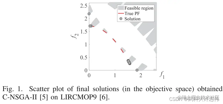 - 在过去的二十年里,为了解决 CMOPs,人们投入了大量精力来开发约束多目标进化算法 (CMOEAs),并与约束处理技术相结合。大多数早期的 CMOEA,如 C-NSGA-II [5],首先将人口尽快推向可行区域,然后考虑优化可行区域内的目标。这可能使种群容易落入一些局部最优区域,如图 1 所示。