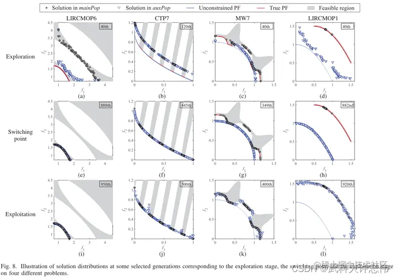 - 在开发阶段,mainPop遵循可行性规律,继续向真正的PF演进。auxPop也越来越接近真正的PF,如图8(1)所示,auxPop在真正PF上比mainPop覆盖了更广的区域。具体来说,auxPop分布在可行区域和不可行区域。auxPop中的不可行的解决方案位于真正的PF周围,具有良好的客观值和低约束违反。图8(j) - (l)表明,这些非可行解可以补充mainPop,找到所有的真PF。
