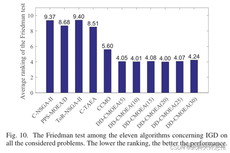 - Discussion: 图9总结了六种算法对所有问题(在三个测试套件中)的平均排名,其中使用Friedman测试来检测它们的差异。排序越低,算法的性能越好。注意,wilcoxon秩和检验用于一次只比较两种算法,而Friedman检验用于根据总体性能对所有算法进行排序。在图9中,DD-CMOEA和CCMO分别表现最好和次之。在图9中,这两种算法明显优于其他四种算法。在表四中,我们显示了每个测试套件中每个算法在测试问题上运行的平均计算时间。虽然DD-CMOEA比C-NSGA-II、ToR-NSGA-II和PPSMOEA/D需要更多的计算时间,但比CCMO(图9中排名第二)和C-TAEA要快。从图9和表4可以看出,与目前五种最先进的算法相比,本文提出的DD-CMOEA算法是一种很有前景的算法。