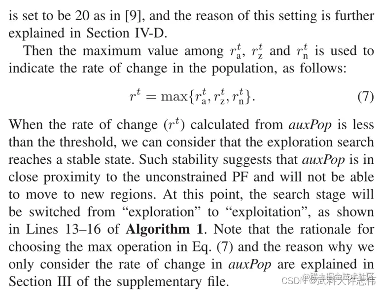 - 进化过程包括探索和开发阶段。当 auxPop 的收敛趋于平稳时,就会发生从探索到开发的阶段转换。