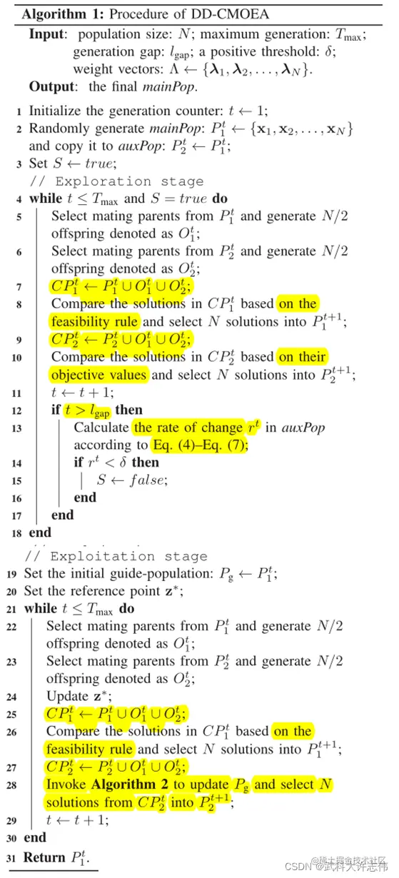 - 算法1给出了DD-CMOEA的伪代码,每个种群具有相同的种群大小N,一开始,mainPop 被随机初始化并复制到 auxPop。在初始化之后,进化经历了探索和利用阶段。这两个阶段在第 III-B 节和第 III-C 节中进一步详细解释,其中 SPEA2 [27] 被用作基本优化器。原则上,DD-CMOEA 可以嵌入到任何 MOEA 中。 DDCMOEA中的交配选择策略和遗传算子由所使用的MOEA决定。