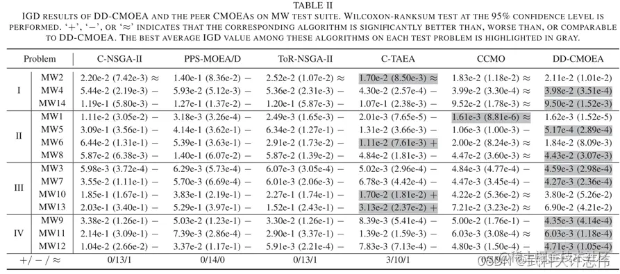 - MW测试套件:表二显示了IGD的平均值和方差在算法随机执行31次的结果。如表二所示,DD-CMOEA在13、14、13、5个问题上显著优于C-NSGA-II、PPSMOEA/S、ToR-NSGA-II和CCMO。与C-TAEA相比,DDCMOEA在10个问题和1个问题上分别有较好的和可比较的结果,而C-TAEA在其余3个问题上有较好的结果。