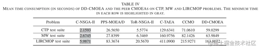 - 特别值得注意的是,当6个CMOEAs在每个MW问题上进行比较时,总是C-TAEA、CCMO或DD-CMOEA中的一个胜出。其中,DDCMOEA的成功率最高,相对优势最明显。C-TAEA、CCMO和DD-CMOEA的一个共同特征是,它们在进化过程中都使用了两个协作群体(或档案)。然而,DD-CMOEA与C-TAEA和CCMO在勘探开发策略上有所不同。因此,上述结果暗示了保持两个种群的优点,也表明了DD-CMOEA所采用的策略的有效性。