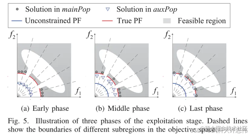 - mainPop 和 auxPop 旨在在开发阶段协同收敛到真正的 PF。设计目的如下:在无约束PF和真实PF相同的问题下,两个种群可以继续合作寻找具有更好目标值的解;对于两个 PF 不同的问题,mainPop 和 auxPop 可以分别从可行侧和无约束 PF 向真实 PF 移动。在这个过程中,mainPop 向 auxPop 提供了真实 PF 的大致位置信息,使 auxPop 能够利用真实 PF 附近的不可行方案。 auxPop 中保留的好的不可行解决方案反过来帮助 mainPop 优化目标。