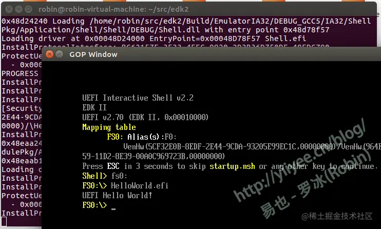 可以看到,很正常的运行了HelloWorld.efi。那UDK2018为什么在Ubuntu上运行模拟器不正常?明明在win10上,一直用到现在都没有出过问题。有机会再研究研究。