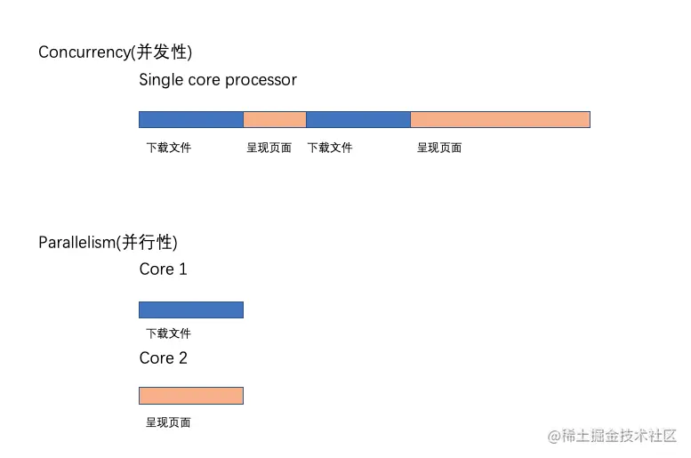 假设同一浏览器运行在多核处理器上。在这种情况下,文件下载组件和HTML呈现组件可能同时在不同的内核中运行。这就是所谓的并行性。