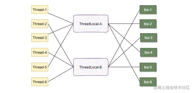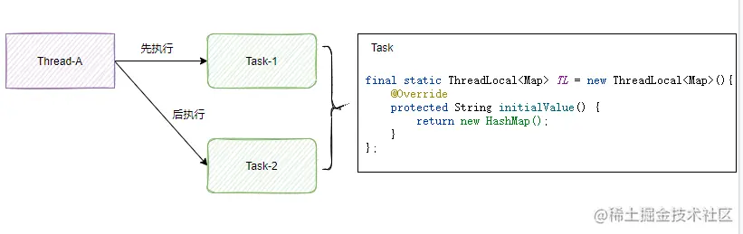 如上图因为TL是一个静态变量,所以每次new Task()是不会对TL重新初始化,就会导致当Thread-A在执行完Task-1后再执行Task-2时,因为执行它们的时同一个线程,所以,它们通过TL获取到的Map对象实例都是同一个线程特有对象,这就导致Task-2可能会获取到Task-1操作的数据,这样就可能造成数据错乱问题。