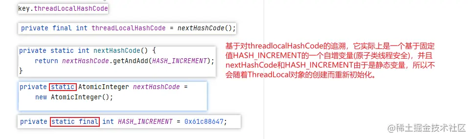 基于对treadLocalHashCode的追溯,我们发现其就是ThreadLocal类中一个自增的静态变量。