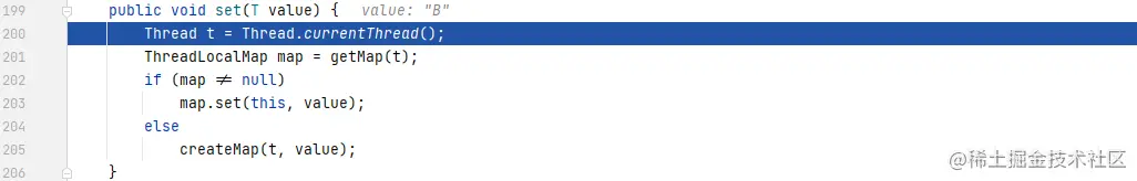 当set结束后,再次调用get获取ThreadLocal代理的实例对象,因为之前当先线程的threadlocals已经被初始化并且存在当前ThreadLocal(TL)对象对应的Entry(第一次get的时候调用initValue初始化为A后面又set为B),所以可以直接获得目标代理的实例对象("B")。