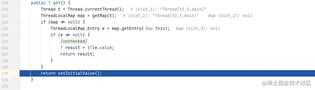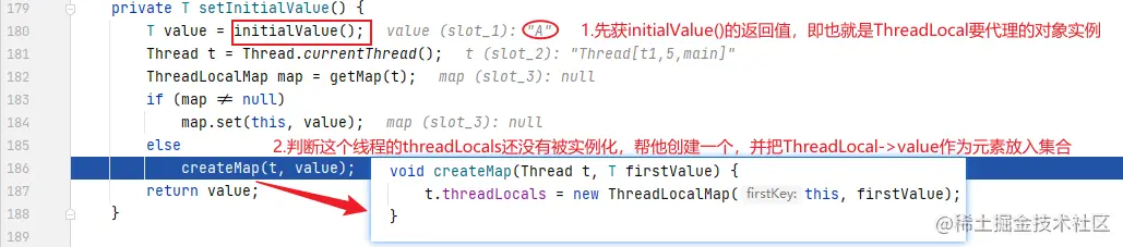 因为此线程对应的threadLocals是一个空值所以要先进入到setInitialValue方法对其进行初始化。