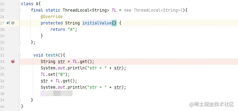 如上我们在ThreadLocalDemo类中新建一个ThreadLocal实例且使用匿名类匿名类将initialValue方法重写。下面调试查看一下整个样例的流转方式。