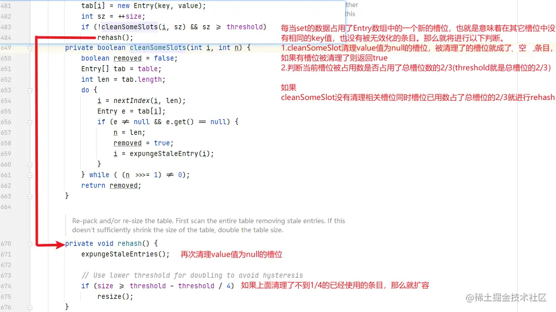 在插入新的条目后要对Entry数组进行遍历查找value为null的Entry,并将其对应条目置为null,然后判断Entry数组是否需要进行扩容操作。