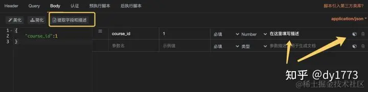 如图中所示,对于一个填写过的参数,我们可以在新建接口可以通过点击参数描述后面的♦️方块标志快速导入描述,不用重复打字。对于raw类型的body参数,我们可以通过点击“提取字段和描述”来针对参数进行描述的填写: