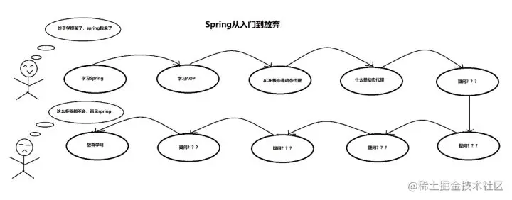 第一个问题,基础不牢。我不知道大家学习spring时是什么样的,但是我觉得大同小异,说说我的经验吧,无论自学还是上培训班,老师都会灌输一个这样的概念:三大框架是个半成品软件,能简化开发。(确实是这样,但是要初步理解实现原理是有门槛的,那就是基础)可是随着知识点的深入,很多人基础不牢的问题就都暴露出来了,一个知识点不会导致后面学习非常难受!如果忽略原理,只学习怎么使用,或许也是一种办法,但这种方式会给初学者造成巨大的打击,会让他们觉得自己不行,框架很难! 因此大家千万不要有这种想法,你离成功不远了 。 下面的图可能会比文字更形象一点:
