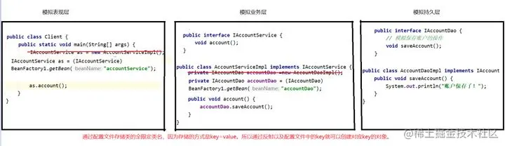 首先是配置文件,我们编写了两个键值对,用来表示两个类的全限定类名。这个配置文件用在工厂类中,在工厂类中先用静态代码块获取配置文件中的信息,这样就能获取到配置文件中的key,从而通过key来创建自己想要的对象。(通过反射创建,具体看图)。如果你对反射不太了解可以看看这篇文章,可选读6即可理解这里如何通过反射创建对象。