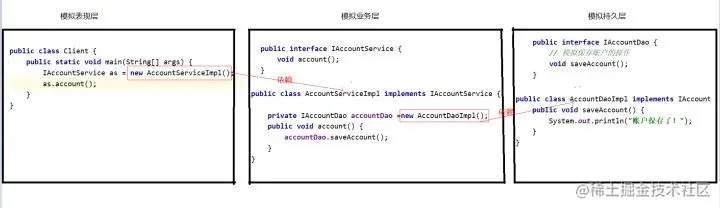 这个保存账户的功能我们实现了米有?实现了吧,但是不够完美,这里出现了与原生JDBC一样的问题。这个问题就是表现层依赖了业务层,业务层依赖了持久层。 这句话相信很多初学者是似懂非懂的感觉,说简单点就是如果没有AccountServiceImpl这个业务层实现类,表现层的代码是不是编译都通过不了,同样的业务层跟持久层也存在这样的问题。总之,一出现new就会产生依赖。