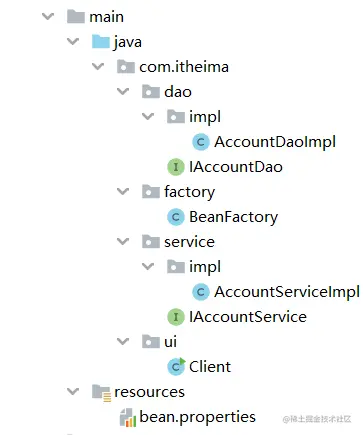 针对上面的问题我们又应该如何解决呢?从原生JDBC中我们似乎用到了全限定类名可以规避new对象的问题。同样的在这里我们可以使用通过配置文件来存储类的全限定类名,存储的方式我们使用key-value形式。然后通过反射,通过key就能创建key对应的对象。从上面的项目结构图中可以看到一个bean.properties和一个工厂类,下面贴出这两部分代码,然后在说明一下。