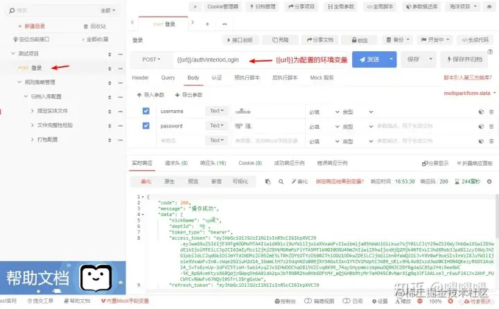 1.输入请求地址,{{url}}为刚刚配置的变量名,输入参数后发送请求,这时可以看到返回值,下一步配置token