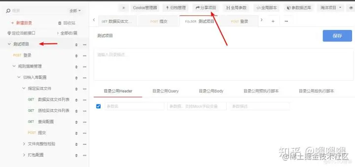 1.选择目录层级,可以分享整个项目,也可以单独分享某一个接口,点击【分享项目】,会生成一个链接地址