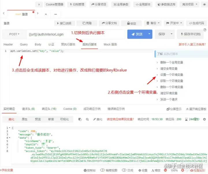 2.点击【后执行脚本】,点击右侧【设置一个环境变量】,会自动生成相应脚本