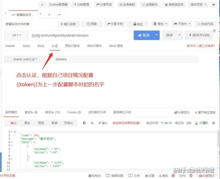 新建一个接口,点击【认证】,根据自己项目情况进行配置,{{token}}为上一步自己起的key名字
