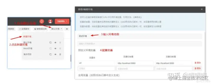 点击右上角环境选项,点击【新建环境】,输入环境名称,配置变量。配置好后注意切换到该环境下再进行后续操作