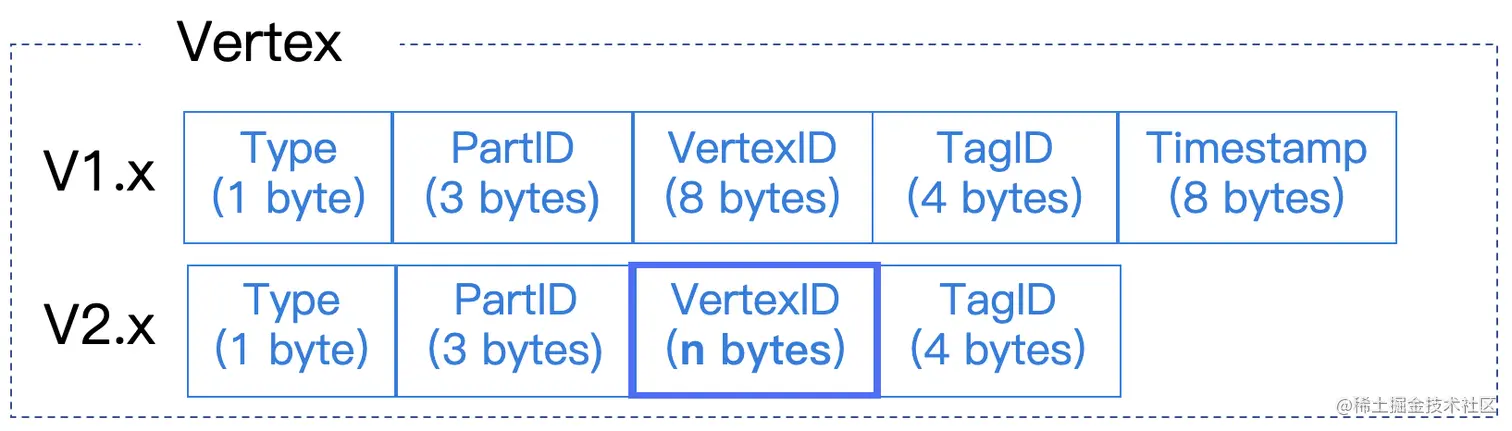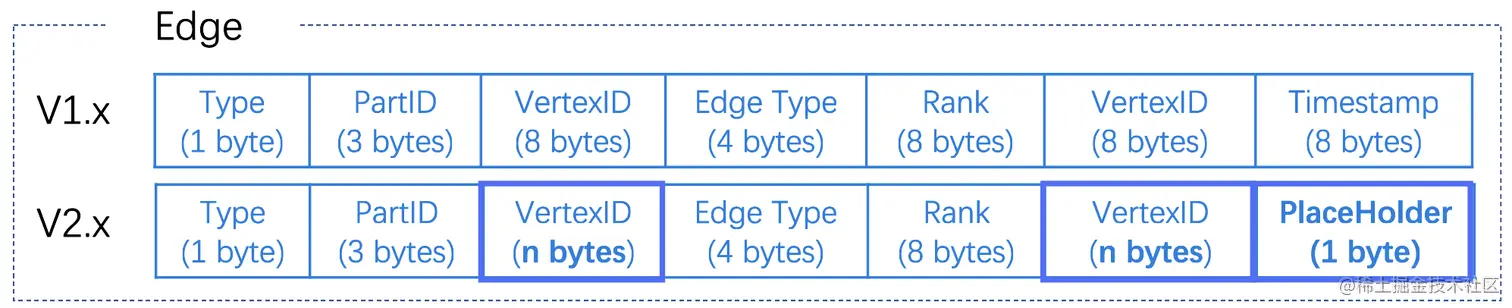 从上图你可以看到存储了个 Type 类型,在 v1.x 版本中无论点和边 Type 类型都是一样的,所以就会发生上面说到过的扫描点会夹杂多个边的问题。在 v2.x 开始,将点和边的 Type 进行区分,前缀 Type 值就不一样了,给定一个 VID,无论是查所有 tag 还是所有边,都只需要一次前缀查询,且不会扫描额外数据。