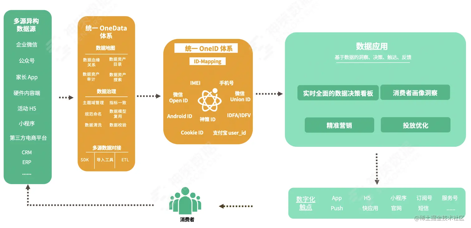 由于智能硬件的消费决策链条较长,消费者数据分散在多种平台上,想要管理和应用好这些用户数据,首要条件是通过 CDP(消费者数据平台)将多源用户数据进行全面地采集、整合,形成统一化的 ID 体系,进而形成全面消费者画像,为公域广告投放、私域精准运营提供有力支持。
