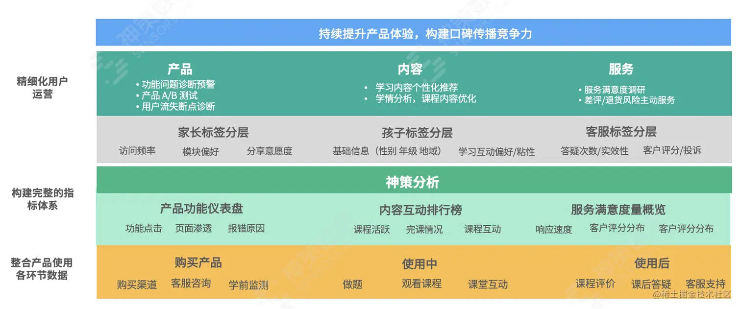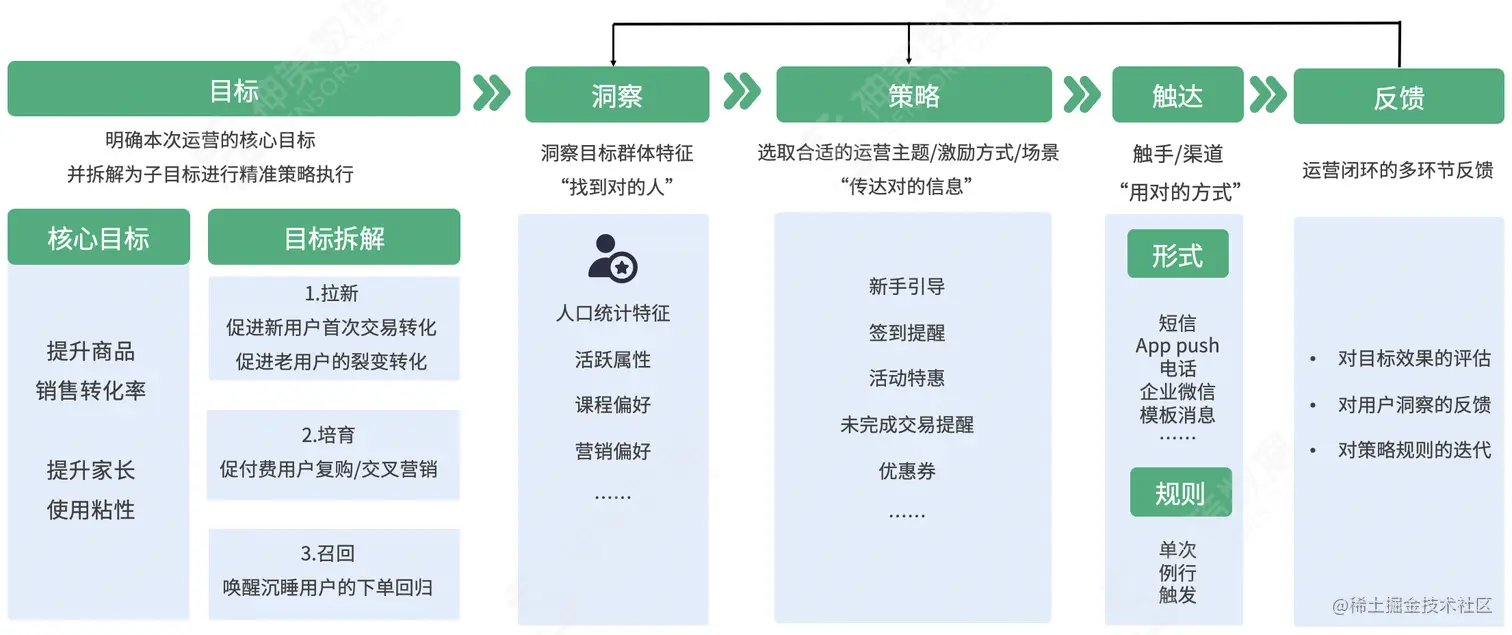 对于用户需求洞察,神策数据沉淀出一套**“以终为始”的精细化运营方法论,**即从运营目标出发。针对硬件厂商“提升家长使用粘性”这一核心目标,神策拆解出多个运营策略,关键要素包括: