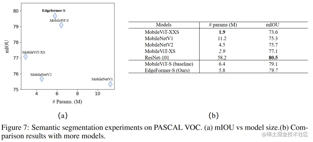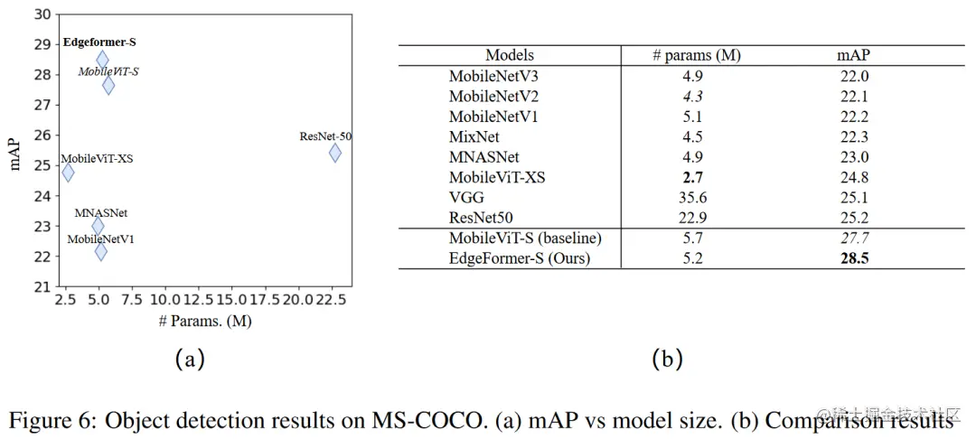 对于 ImageNet-1K 的分类,相较于基线模型 MobileViT,EdgeFormer 以约 5M 参数实现 78.6%的 TOP-1 准确性,节省 11%的参数和 13%的计算成本,但准确性提高了 0.2%,并且推理速度更快(在基于 ARM 的 Rockchip RK3288 上)。仅使用了 DeIT 0.5 倍参数量,但与 DeiT 相比,准确率提升了 2.7%。在 MS-CCOCO 目标检测和 Pascal VOC 分割任务上,EdgeFormer 还显示出更好的性能。