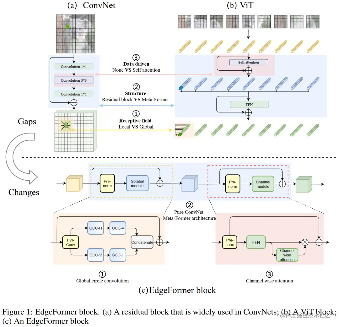 受此启发,GCC 被插入 meta-former 风格的结构中,从而构建了 EdgeFormer block。其中替换自注意力模块为 GCC,从而作为一个新的空间处理单元。这主要有两点原因: