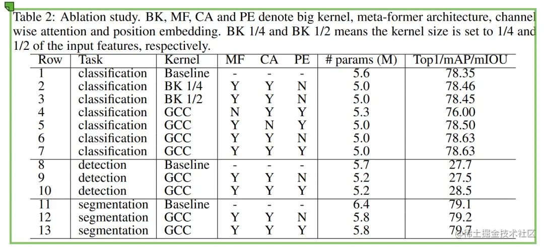 这里在大核卷积的实验中(2、3),随着卷积核的增大性能区域饱和(倒是再增大是否会下降就很难说,只能说可能有这个趋势。这一点现象据说在 ConvNeXt 中也有反映)。而直接覆盖了全局的 GCC 却可以获得更好的表现。