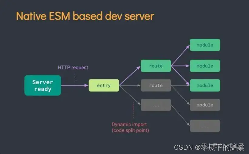 - 对于项目中的业务模块,Vite 利用现代浏览器内置的 ES Module 支持,由浏览器直接向 dev server 逐个请求加载这些模块——因此你往往可以看到本地环境下大量的 HTTP 请求刷屏,这也是 Vite 最鲜明的特征。