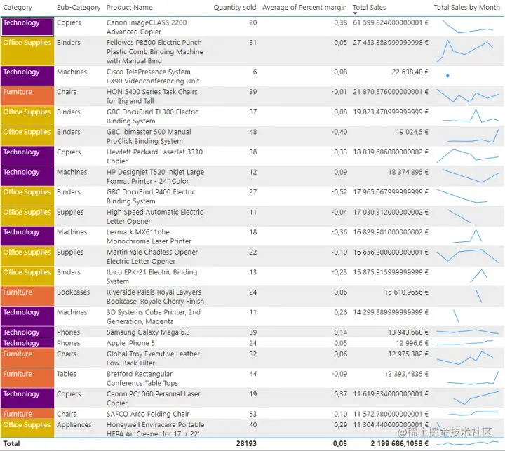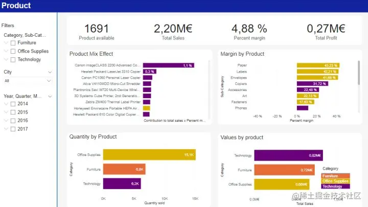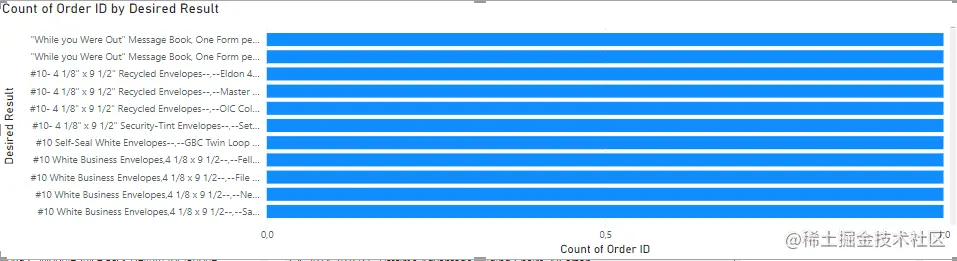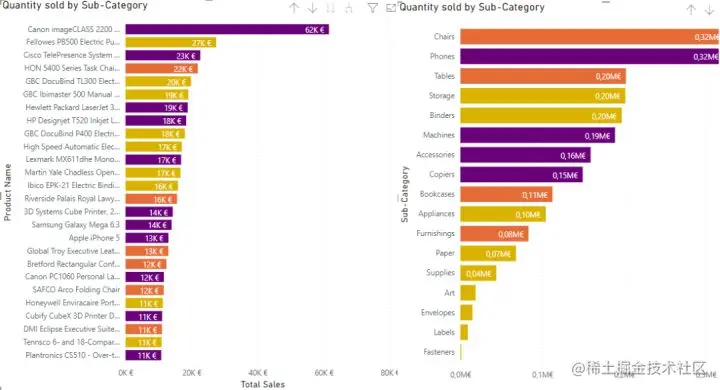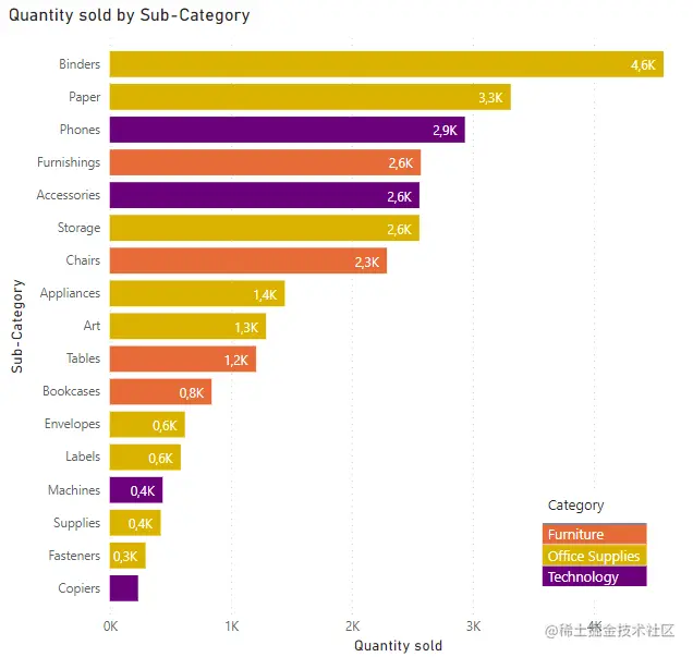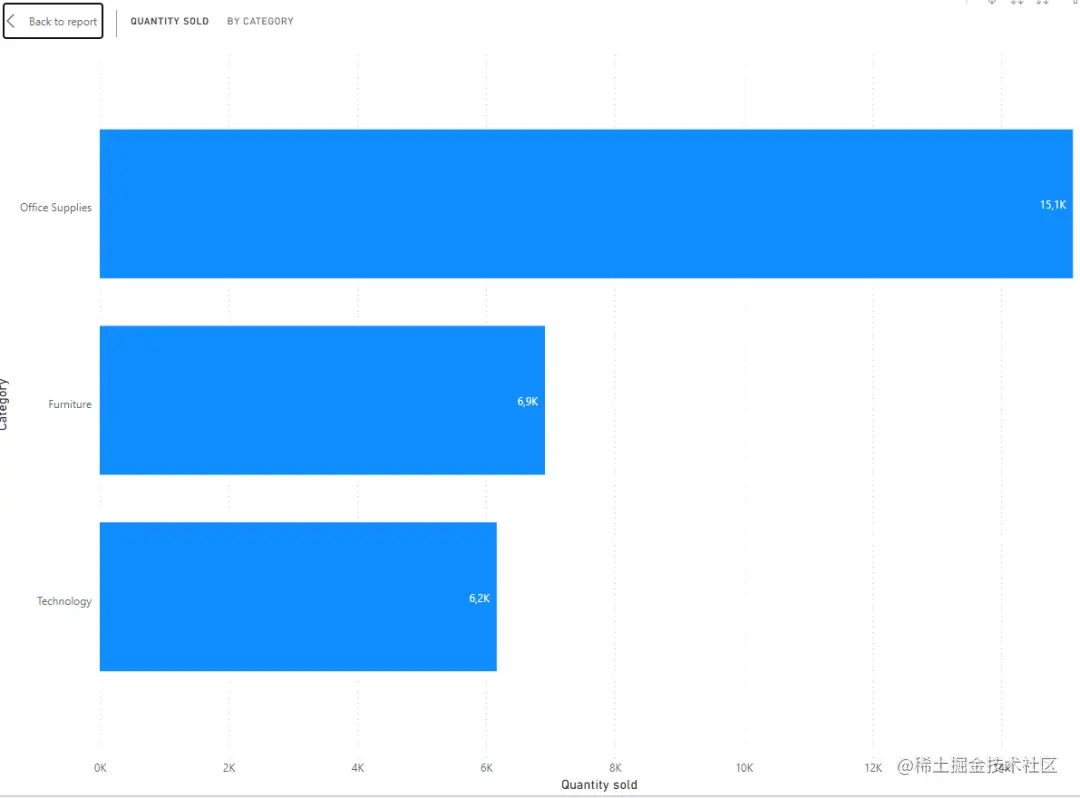 首先创建一个简单的条形图,按类别/子类别/产品来可视化数量。这里使用 Power BI 的“drill down”功能,以避免创建过多的图表: