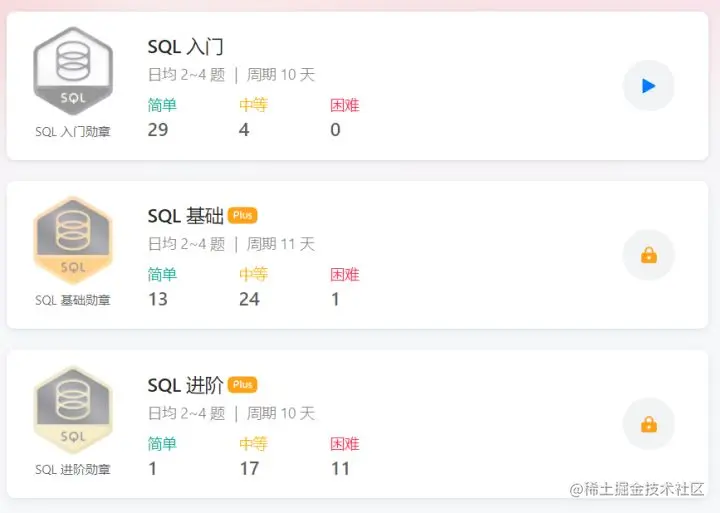 力扣网站上有一个SQL的专项练习,按照难度进行了分类,但是基础和进阶的题目需要付费解锁。