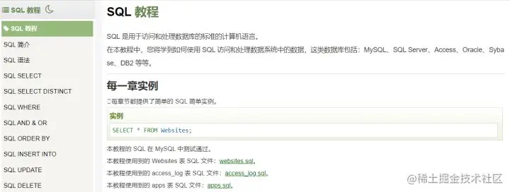 菜鸟教程提供了SQL学习从入门到进阶的教程,非常详细,适合初学者或者作为工具书,不过菜鸟教程没有提供相应的练习题目。