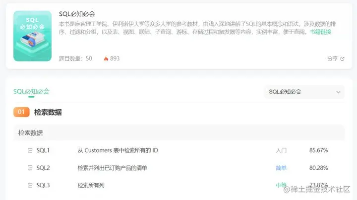 牛客网提供了一个SQL必知必会专项题库,按照知识点和难度进行了分类,非常推荐用来练习SQL。