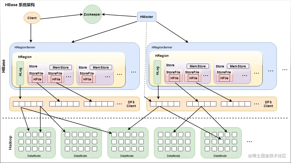 借用这张经典的架构图,虚线以上代表的HBase相关的实现,虚线以下则代表着HBase依赖的底层HDFS相关的实现。