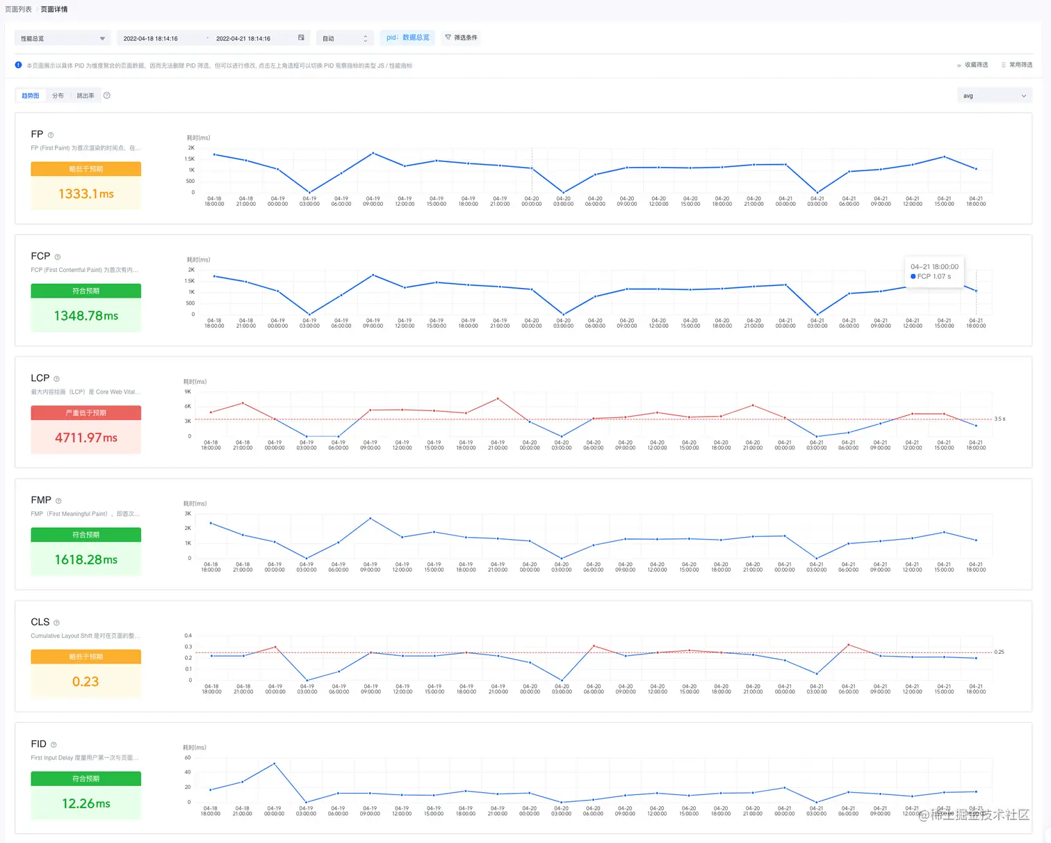 SDK侧,Web Pro监控采集了非常全面的性能指标,包含了fp、fcp、fmp、tti、navigation timing 等常规性能指标,也有lcp、fid、mpfid、cls等最能代表用户体验的指标,此外,页面发生的longtask也会进行上报,更多详细说明可以查看该文档链接以及同级链接www.volcengine.com/docs/6431/1…