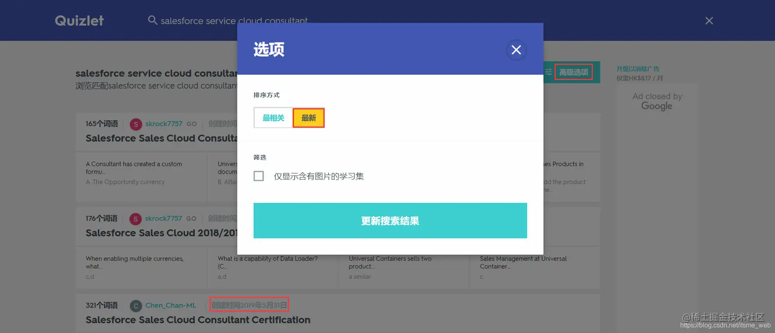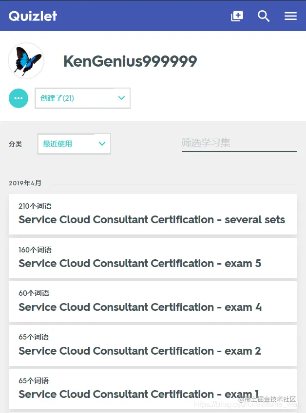 - 在Quizlet上搜索salesforce service cloud consultant,然后按时间排序选择最新的题目来进行练习: