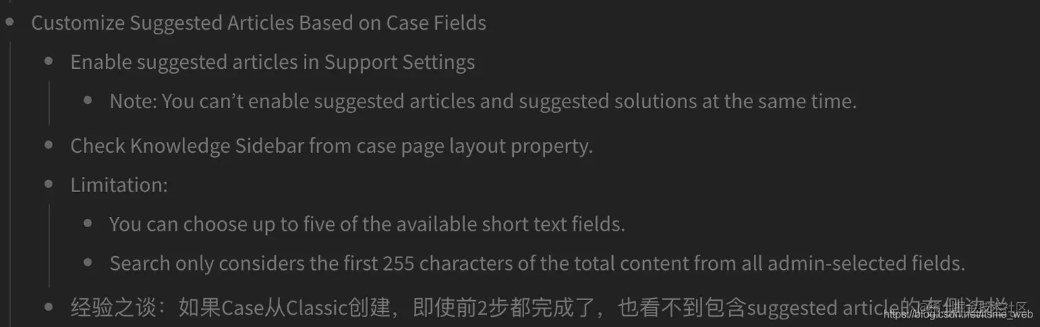 在做Knowledge Basics相关的TH练习时,根据step by step的操作完成Set Up Search Customizations的最后一个环节,按下图操作后,发现classic中创建的case在console里面打开,suggested article sidebar无法显示。