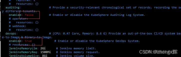 2.编辑cluster-configuration.yaml文件,将里面devops等组件开启(将false改成true)