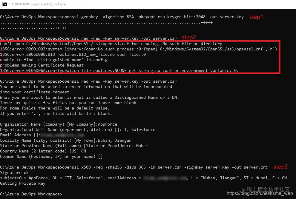 在使用Azure DevOps搭建SFDC CI/CD的时,配置Azure DevOps前,需要使用OpenSSL产生Certificates和Key,按照标准的3步骤操作时,报错如下: