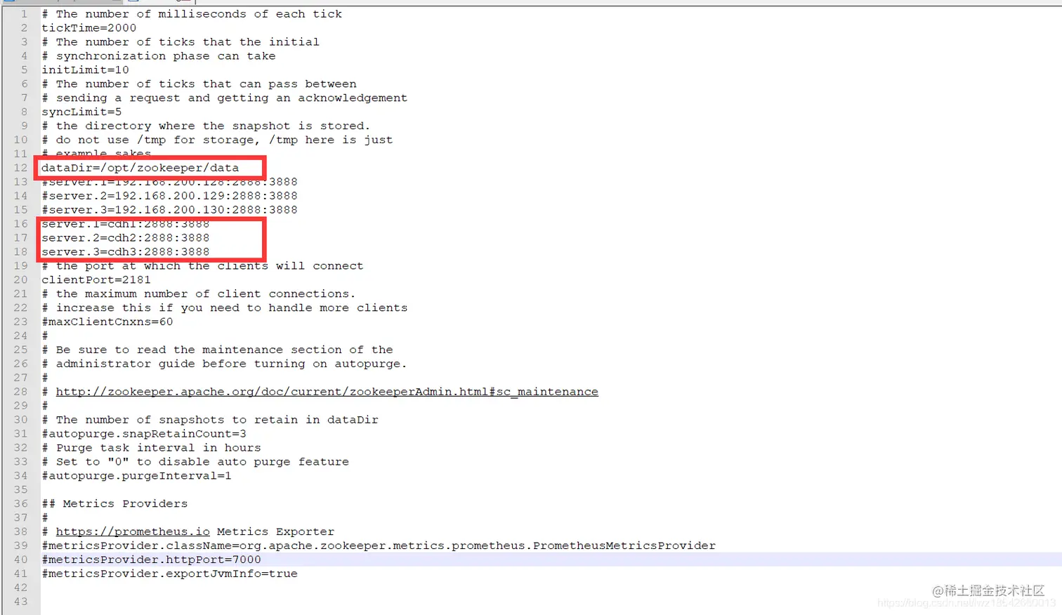 - 修改zoo.cfg文件,修改内容如图,具体数量根据自己节点数来增删,若linux没有配置hosts的话 需要使用IP来进行判断